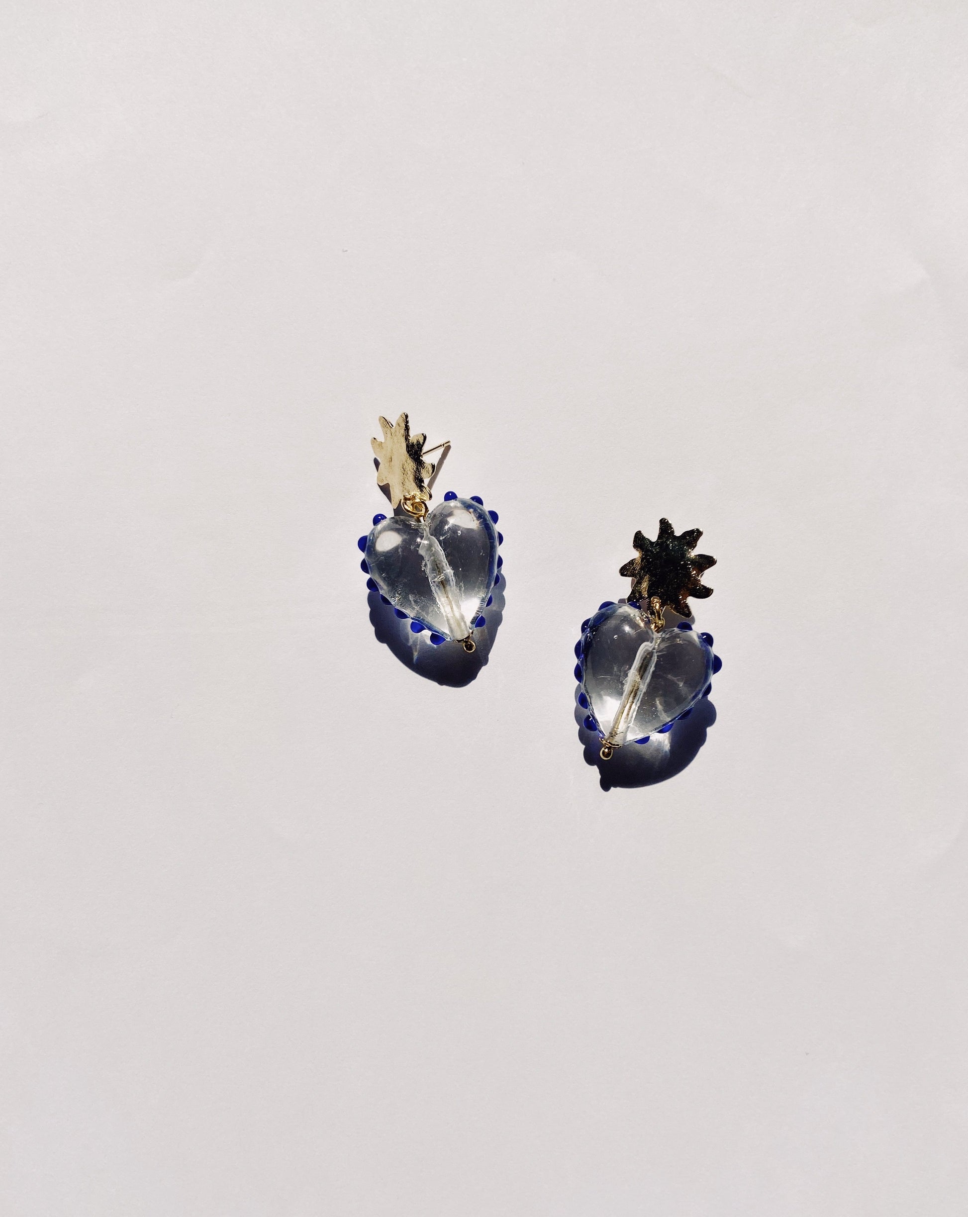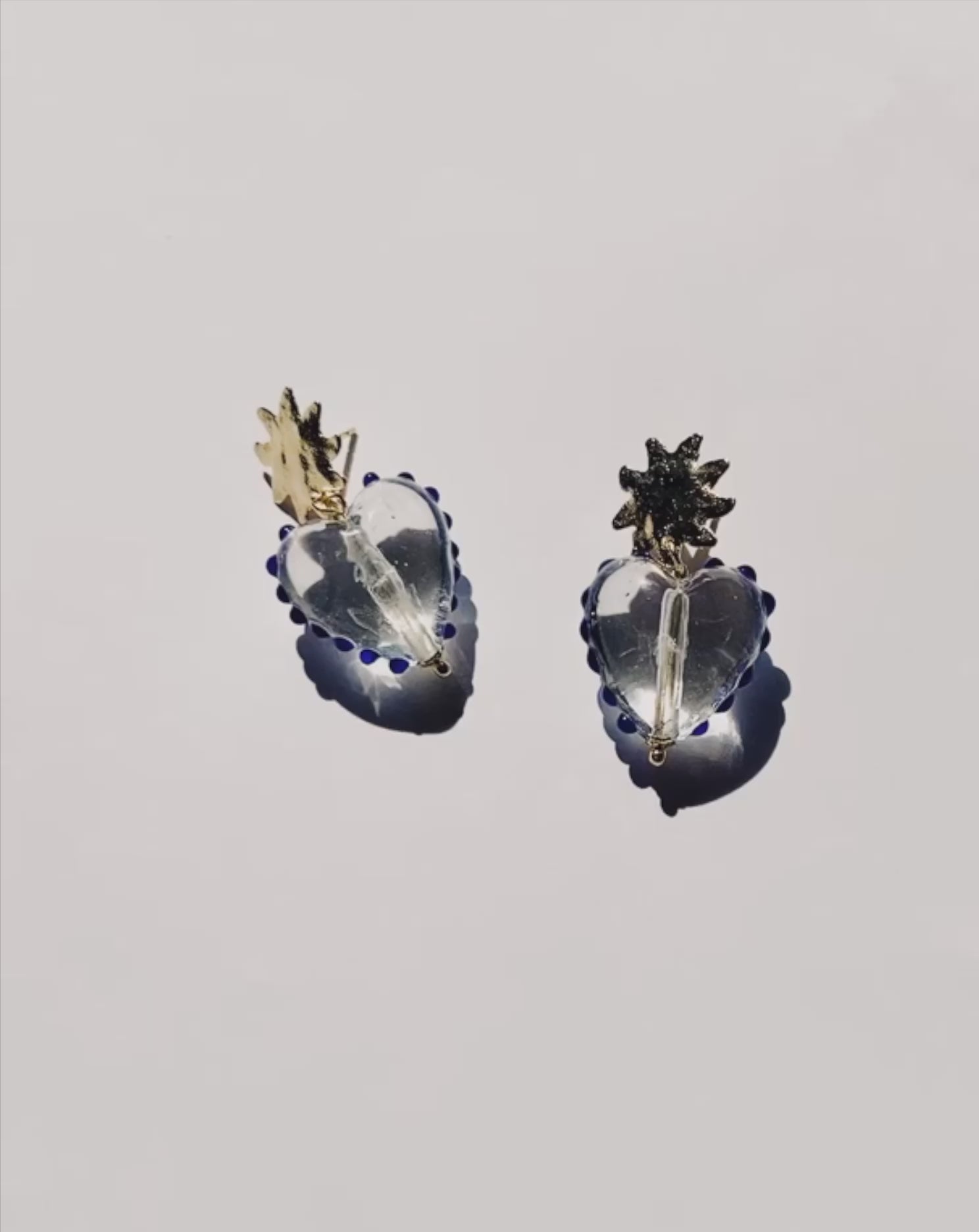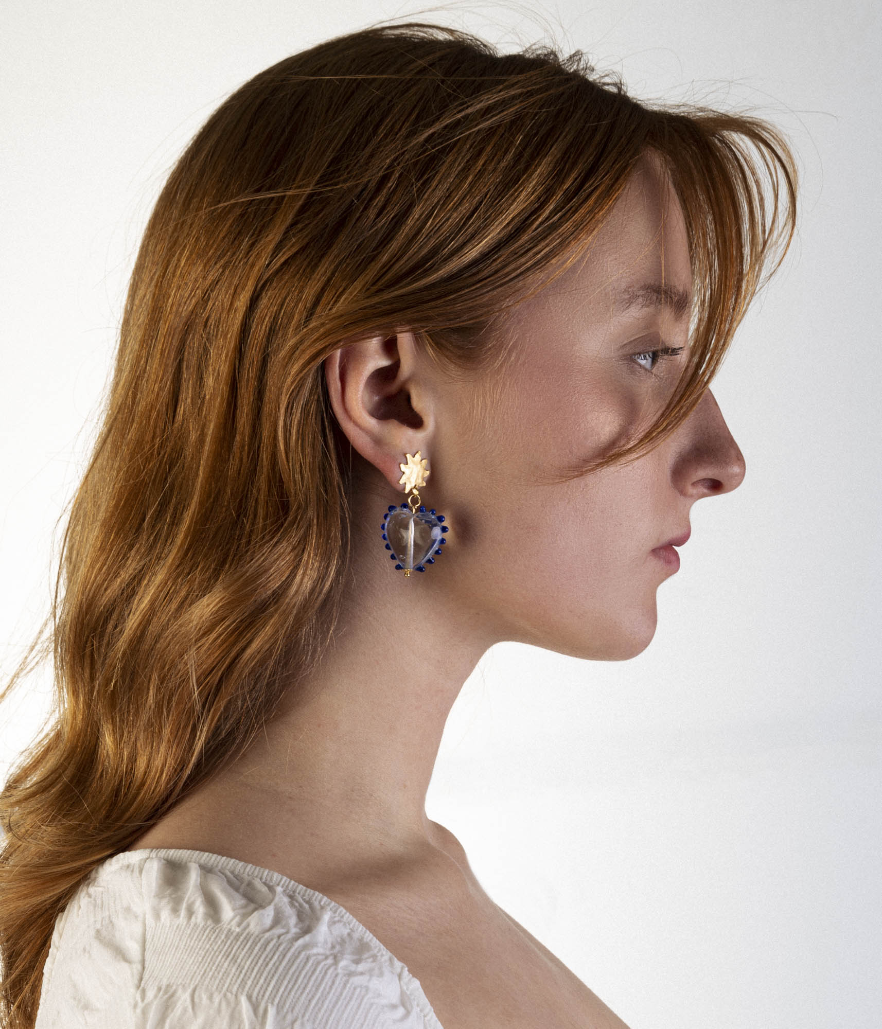 24-carat Vermeil Gold Sun-shaped stud earrings, and lampwork glass earrings in clear with deep blue dots on the sides.