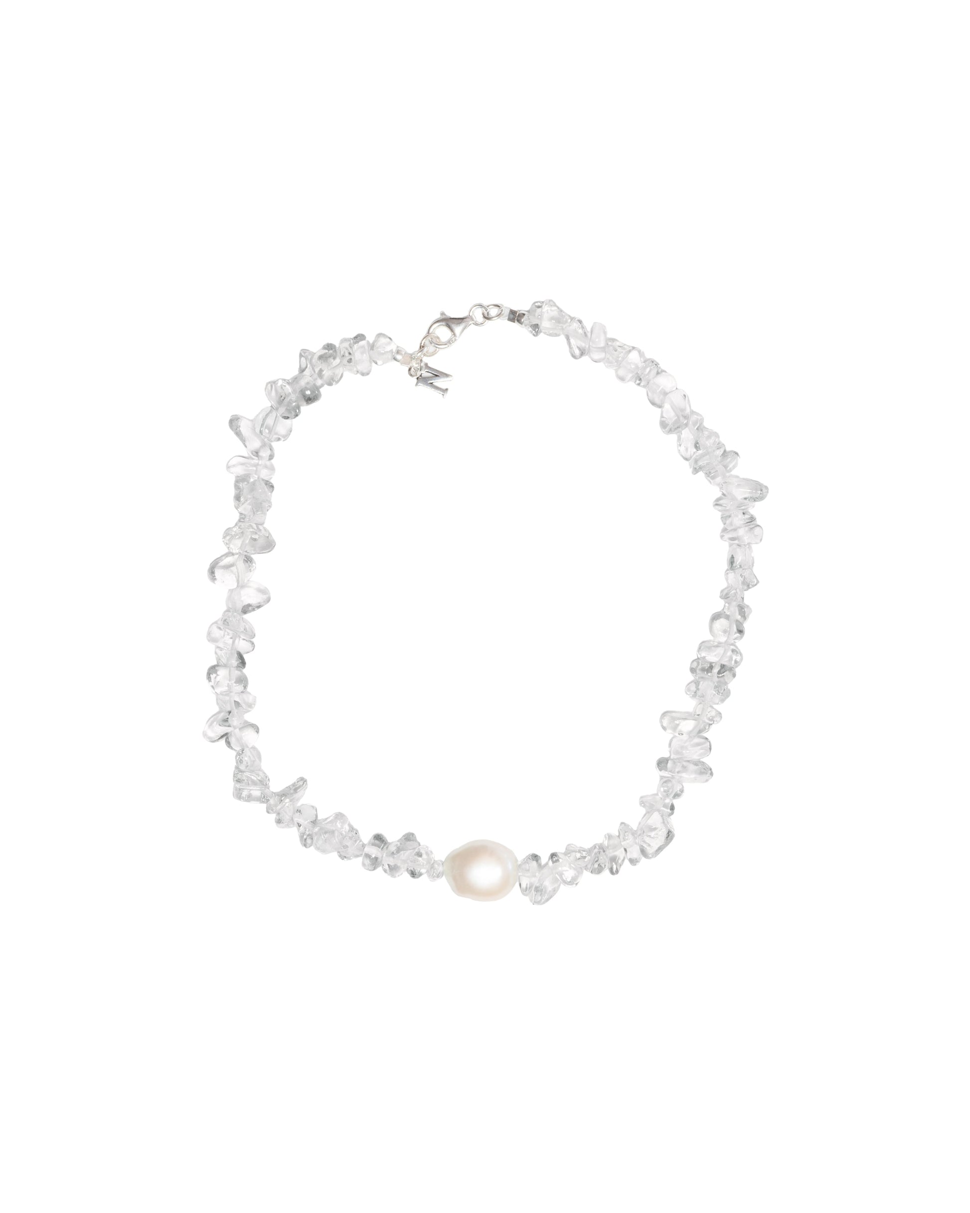 Hand-strung with high-quality Clear Quartz chips, meticulously selected for their brilliant transparency and unique, raw-cut edges. Features a magnificent, large Baroque Freshwater Pearl, celebrated for its irregular, one-of-a-kind organic shape and deep luster. Lightweight and effortlessly chic; a perfect bridal accessory or a refreshing addition to a crisp, monochromatic summer outfit.