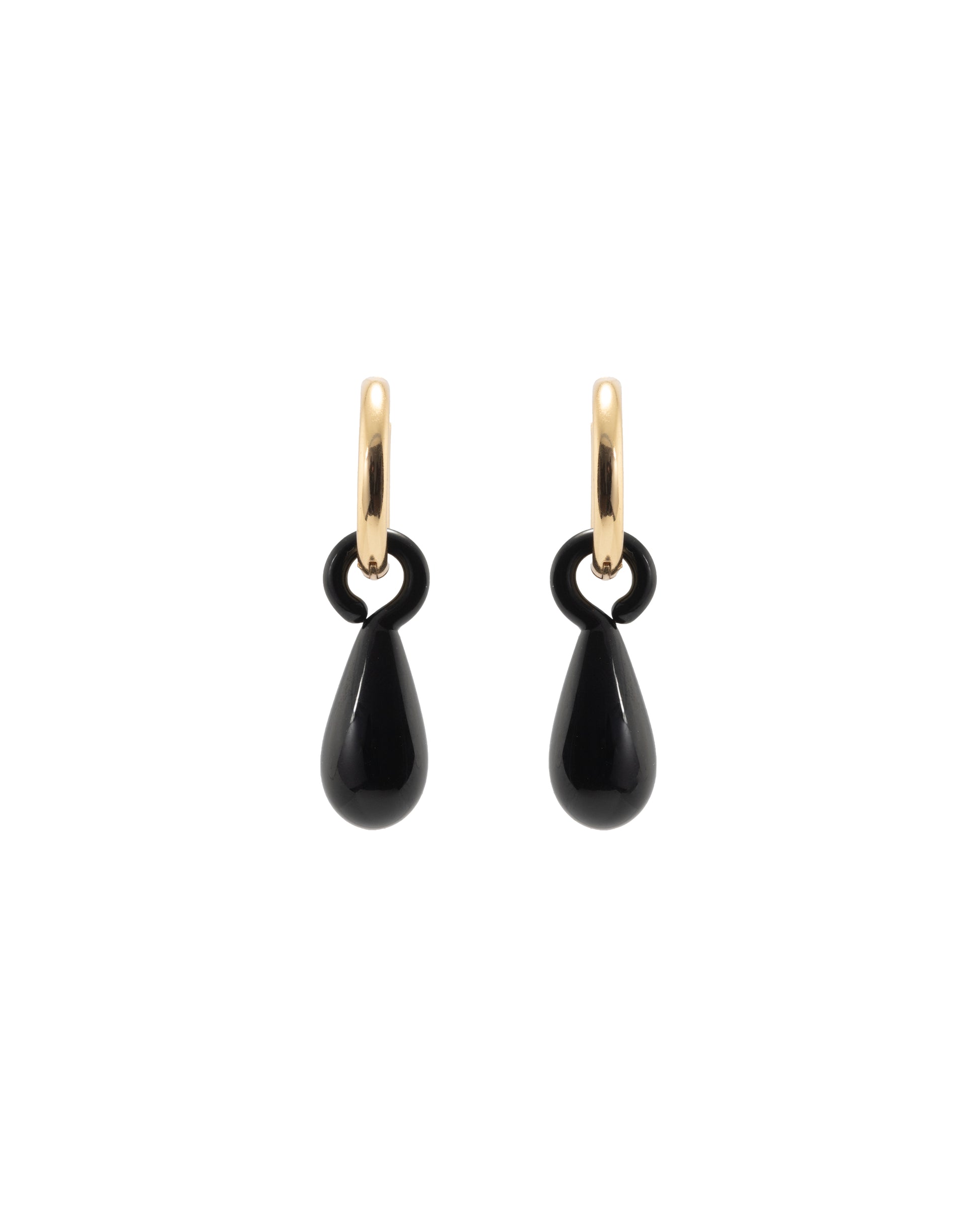 Each piece features a high-shine, jet-black glass droplet suspended from a minimalist hoop.