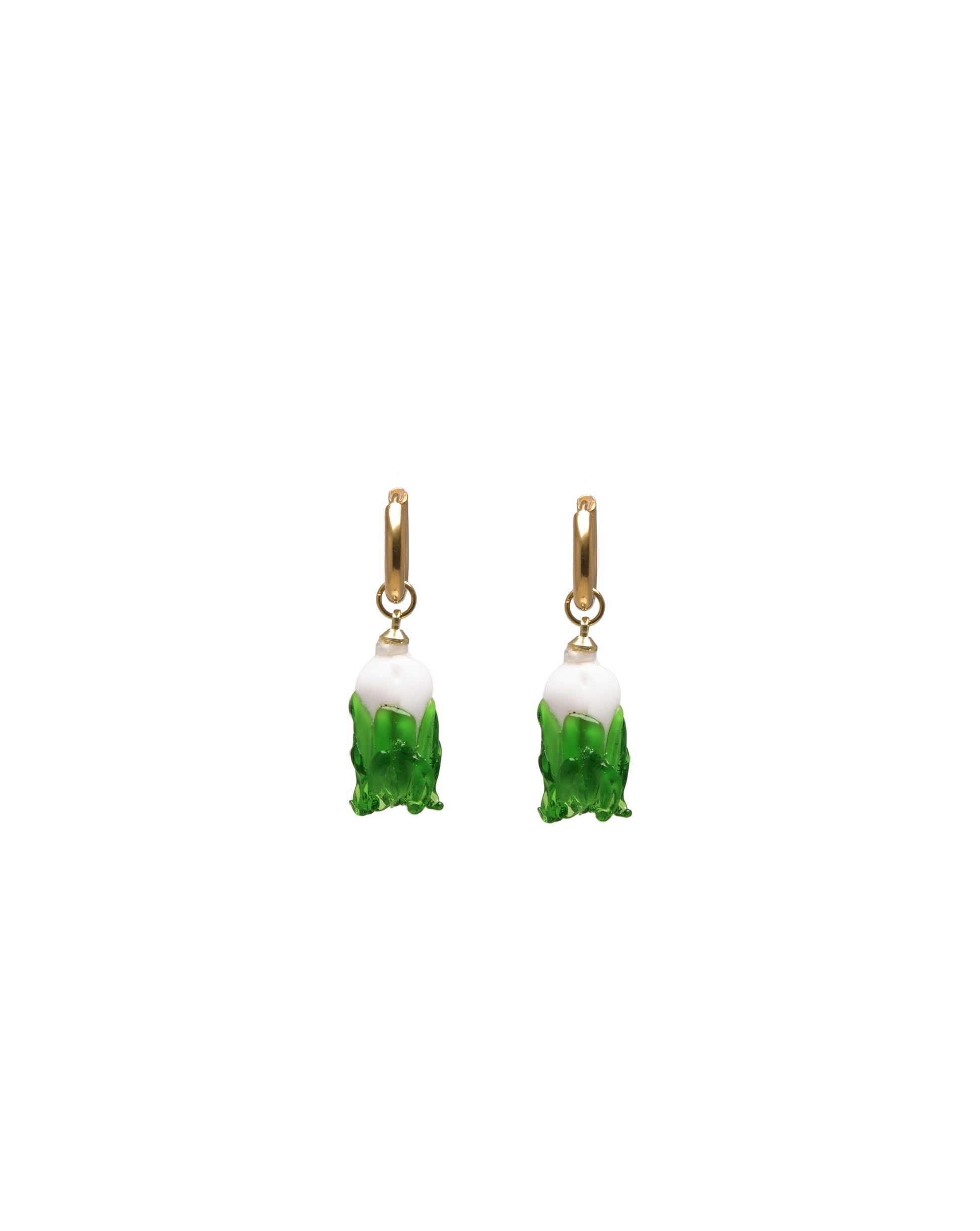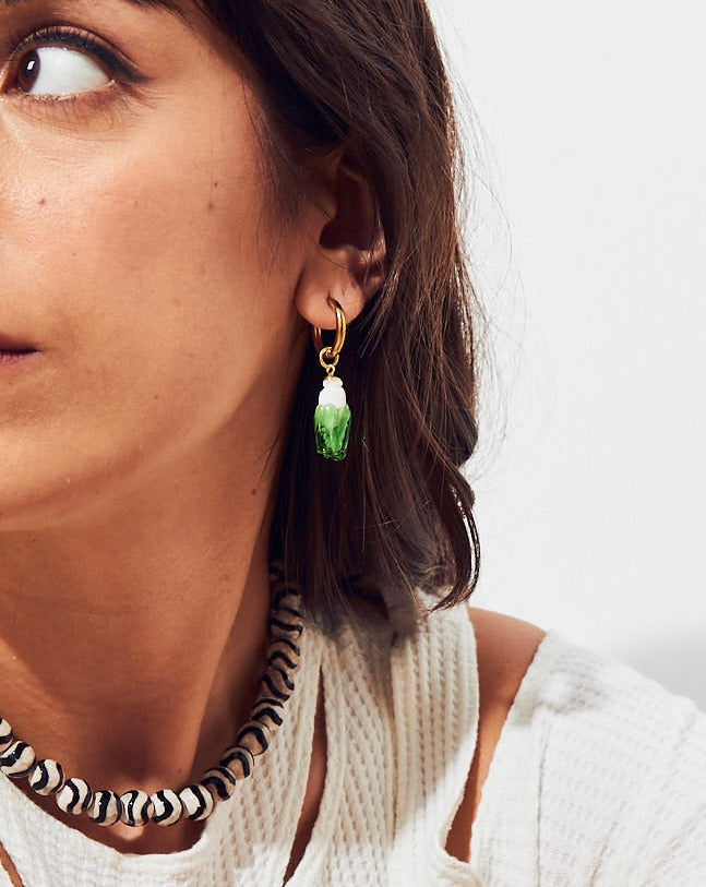Lampwork charm and gold tone metal huggie hoop.