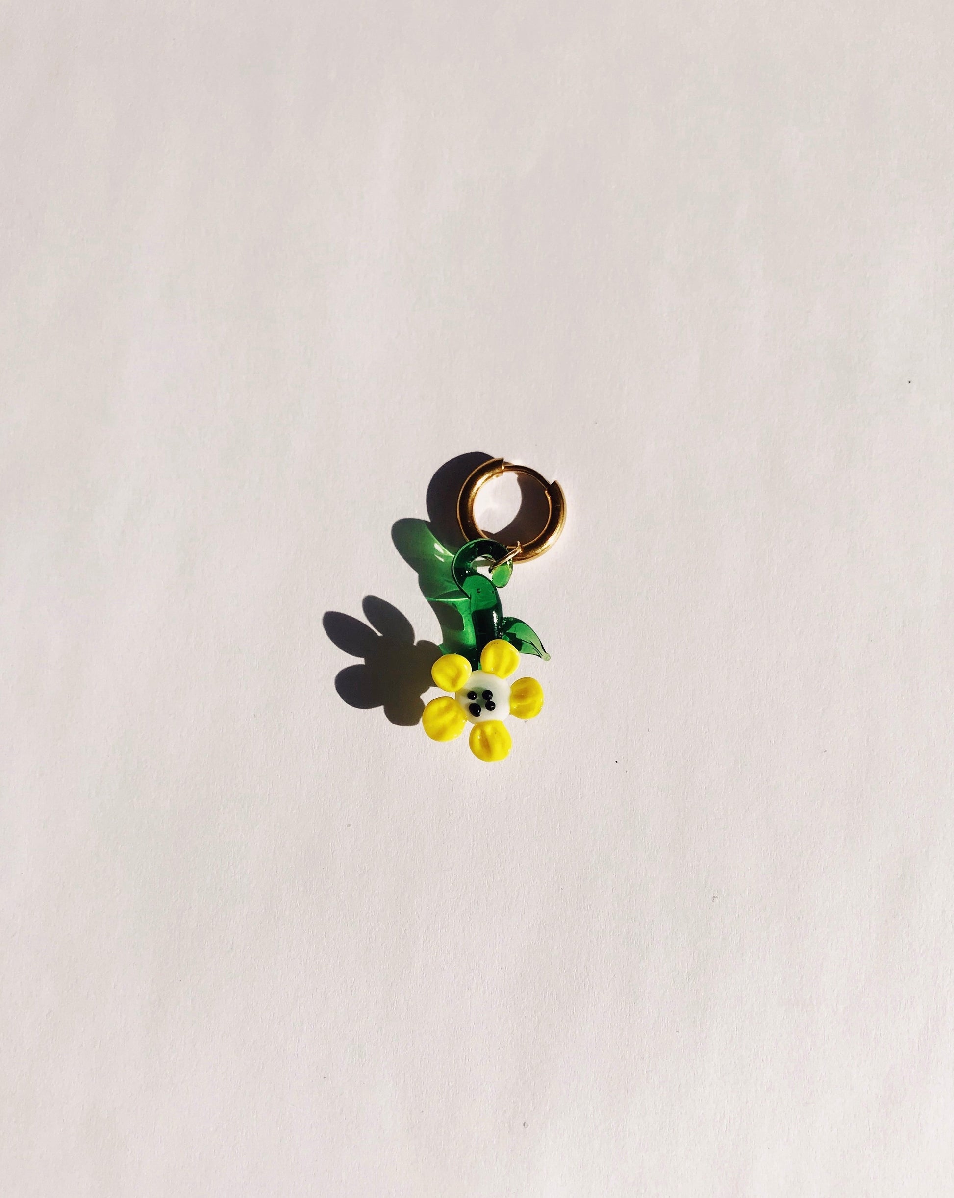 Delicate lampwork flower. Metal gold-plated hoops in 12mm (mini) and gold vermeil shackle.