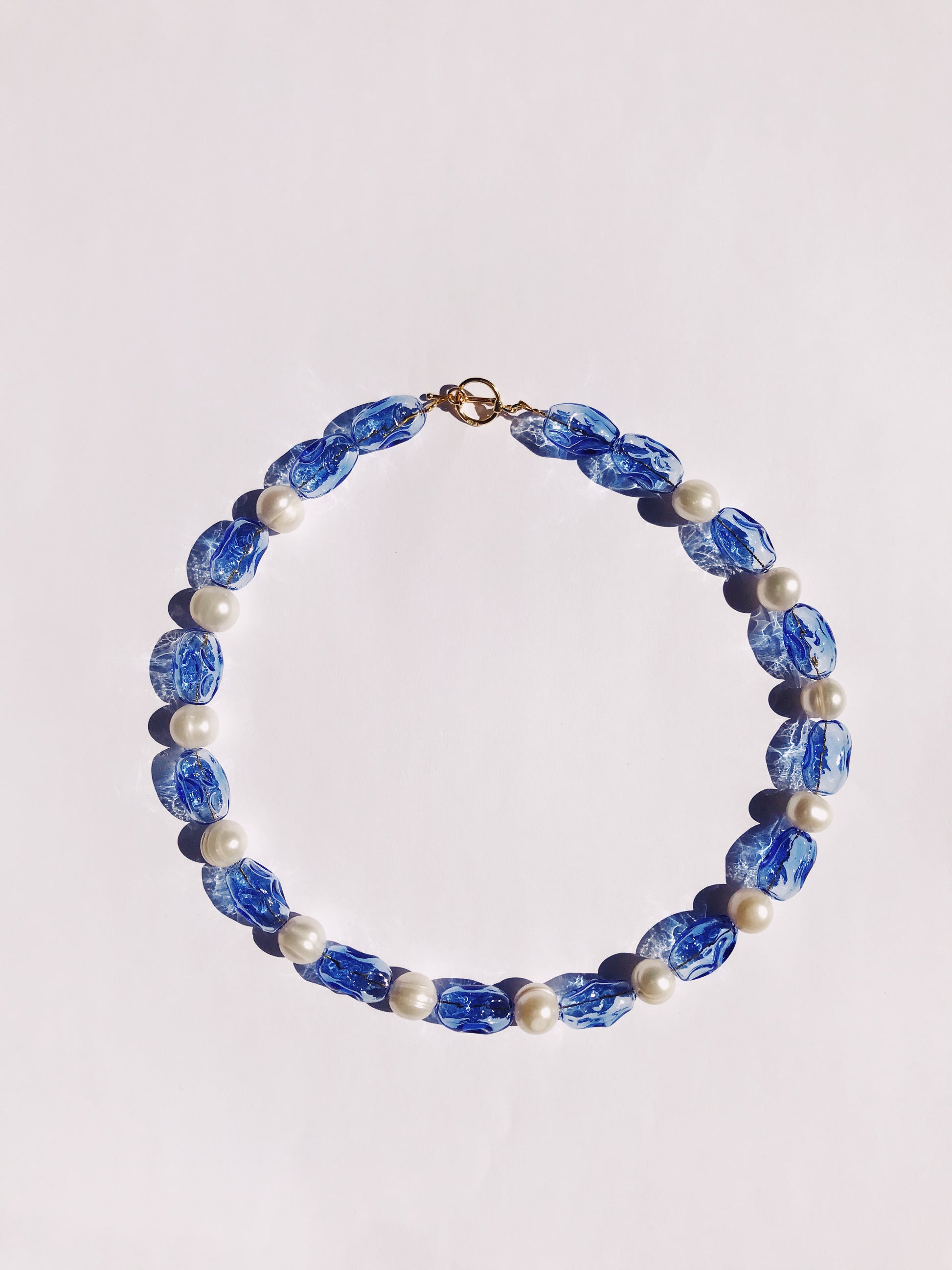 Hollow blown glass beads, fresh water pearls and vermeil gold finding.