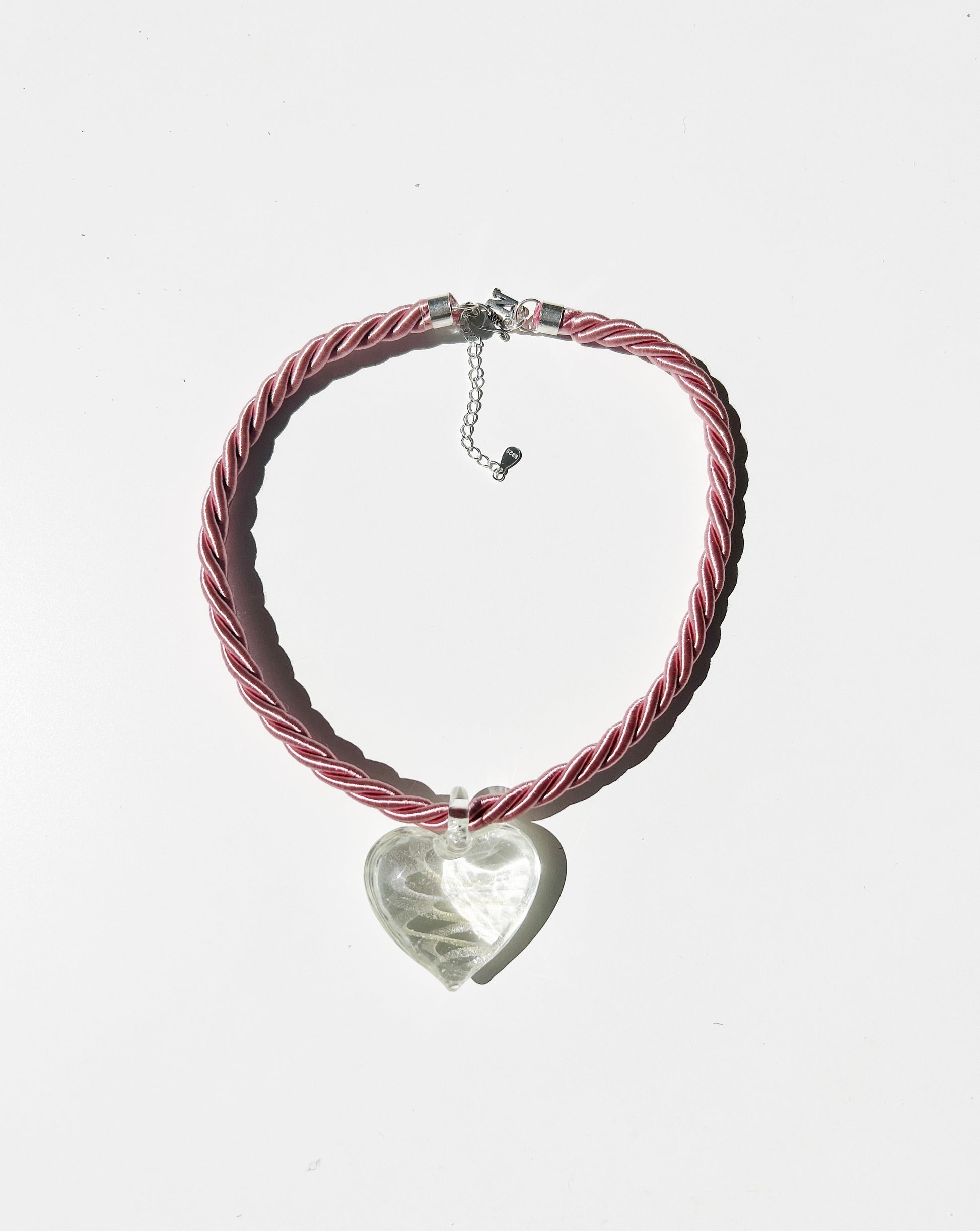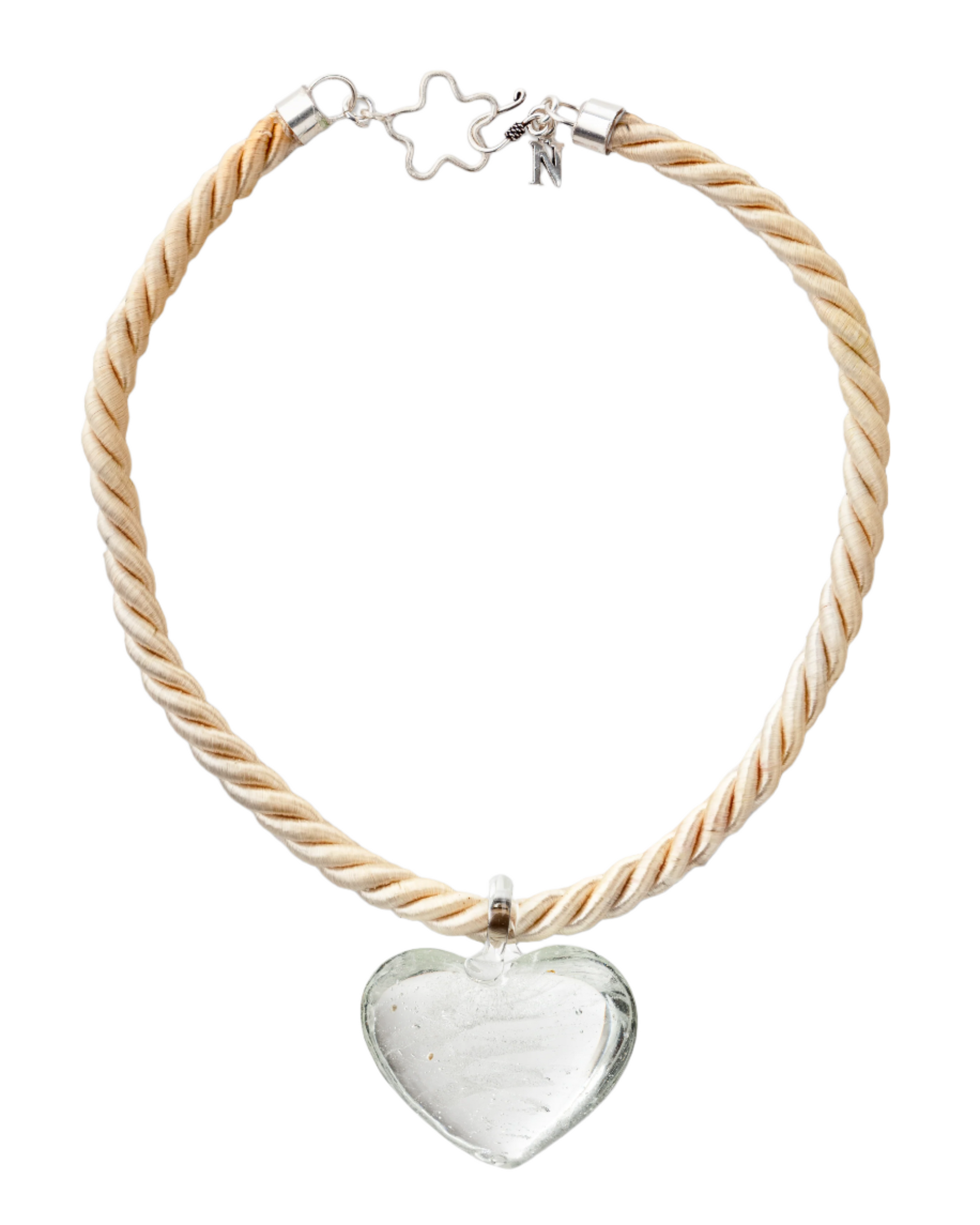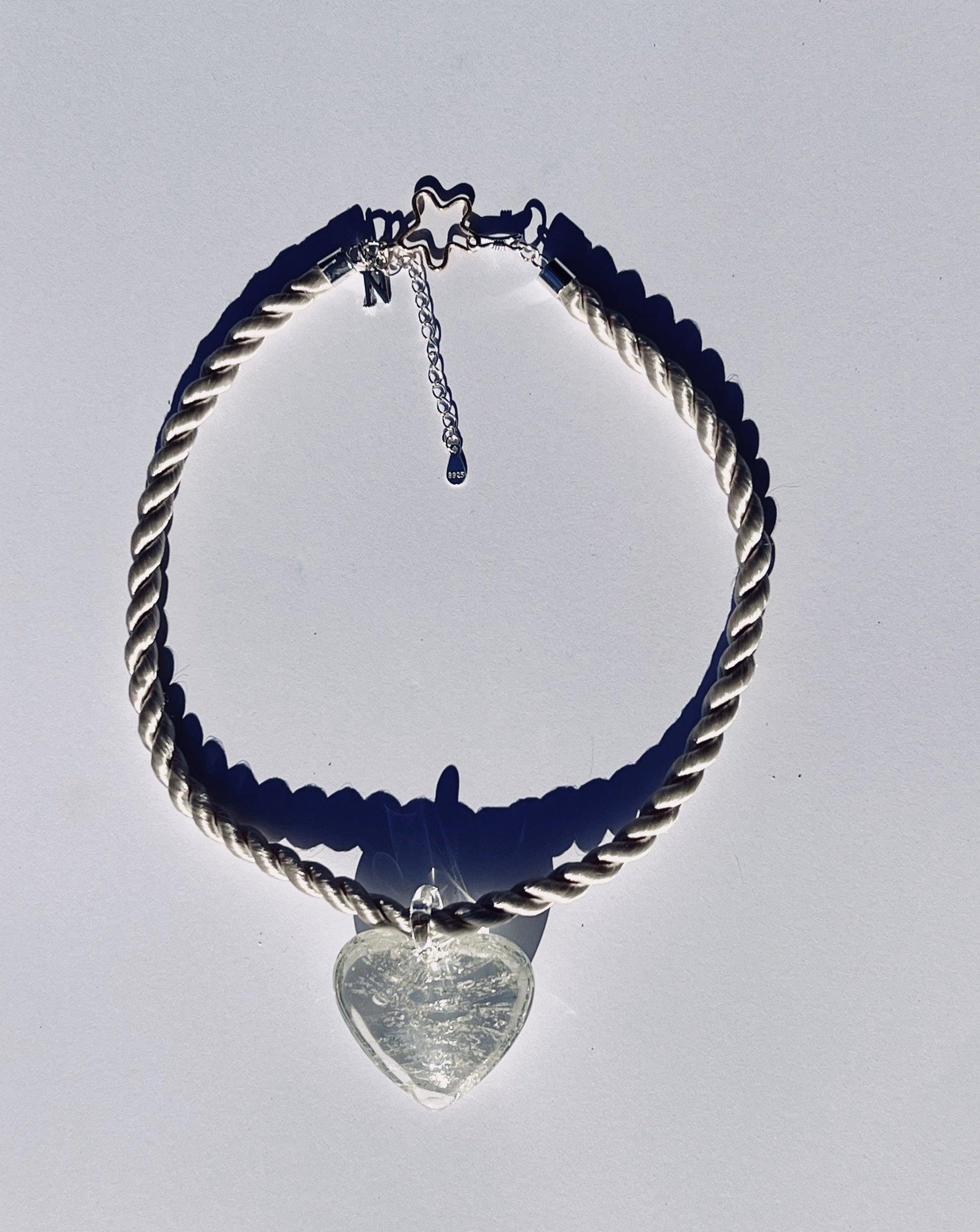 Poly silk cord, handmade glass charm with silver foil inside. All metal parts are sterling silver that can be plated to 24k gold vermeil.